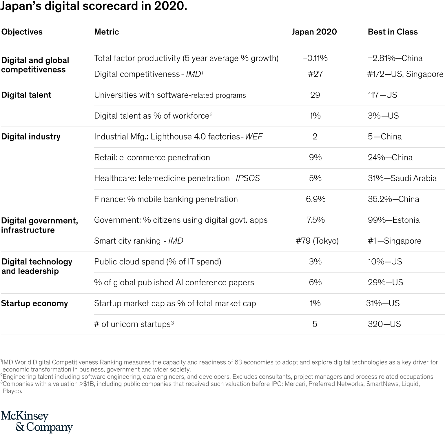 Japan’s relatively low digital competitiveness is in stark and unexpected contrast to the country’s economic strength. In 2020, the country ranked 27th in digital competitiveness and 22nd in digital talent, and it has single-digit penetration in areas such as e-commerce, mobile banking, and digital government-service usage (Exhibit 1). The country has produced just five out of more than 500 unicorn start-ups globally (start-ups with a private or public valuation of more than $1 billion). These metrics fall far short of Japan’s full potential.