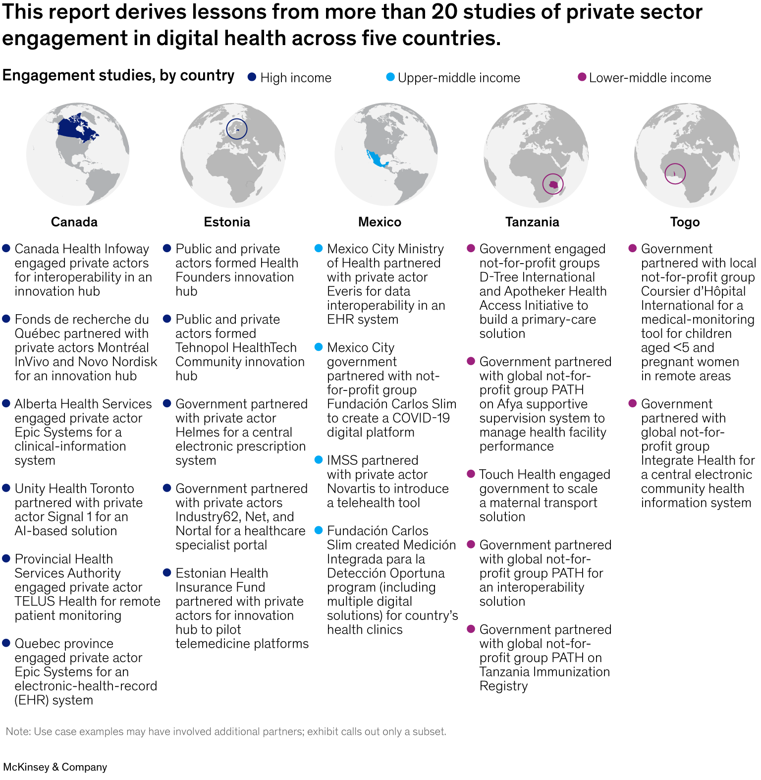 This McKinsey Health Institute (MHI) report, produced under the Digital Health Exemplars (DHE) project within the broader Exemplars in Global Health program, offers leaders a design framework to better structure public–private collaborations to realize digital health’s potential (for additional details or more on the consortium, see sidebar “About this report”). The report derives lessons from more than 20 case studies in five countries: Canada, Estonia, Mexico, Tanzania, and Togo (Exhibit 1). Through desk research, collaboration partner input, and more than 50 expert interviews, MHI distills lessons on how to design, finance, and sustain digital health partnerships with a focus on private innovation and solution providers engaging with the public sector (for more on research design, see sidebar “Methodology”). The report is divided into three sections: the digital health ecosystem, a design framework for private sector engagement, and lessons learned across countries.