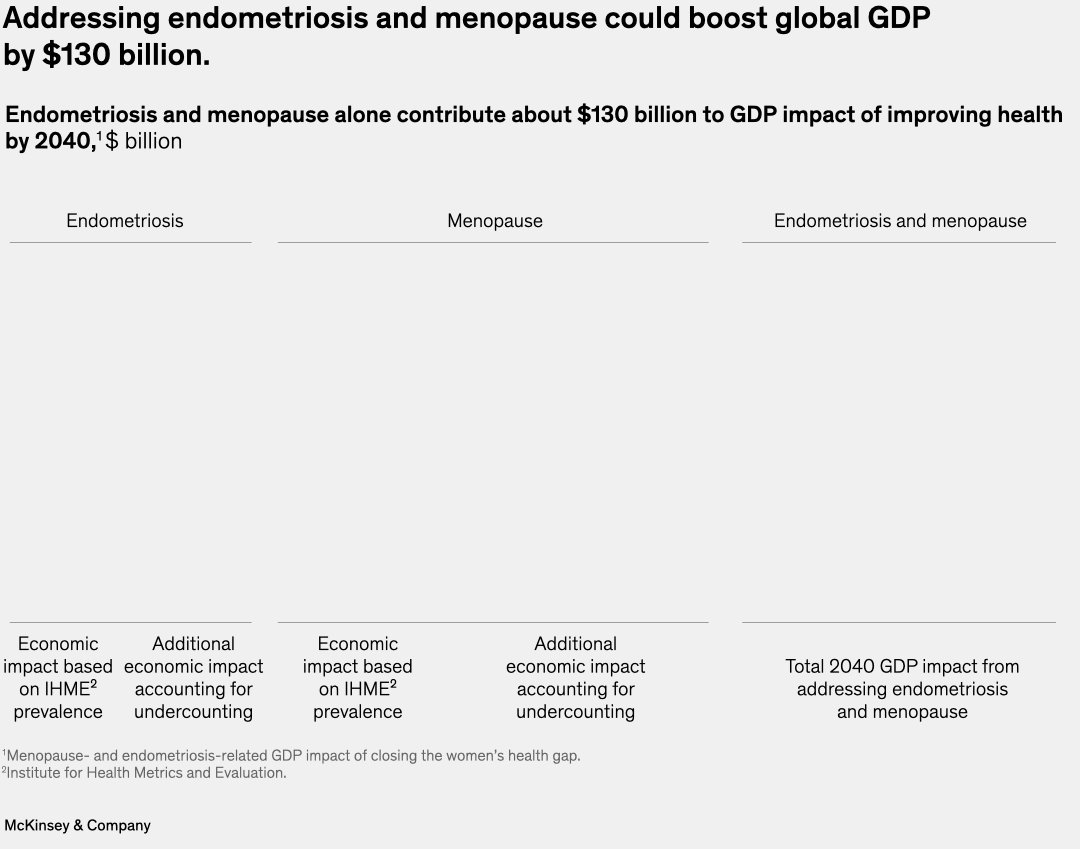 Conversely, the women’s health gap limits individual women and directly affects the global economy by impairing women’s economic participation and productivity. Chronic diseases are often linked to extended absences from work,87 and poor health is a cause of “presenteeism,” where individuals go to work but cannot perform at their full capacity, reducing productivity. Finally, disabilities and informal caregiving obligations hold back affected individuals, often women, from full workforce participation (see sidebar “Endometriosis and menopause have a substantial impact on women’s ability to work and earning potential”).