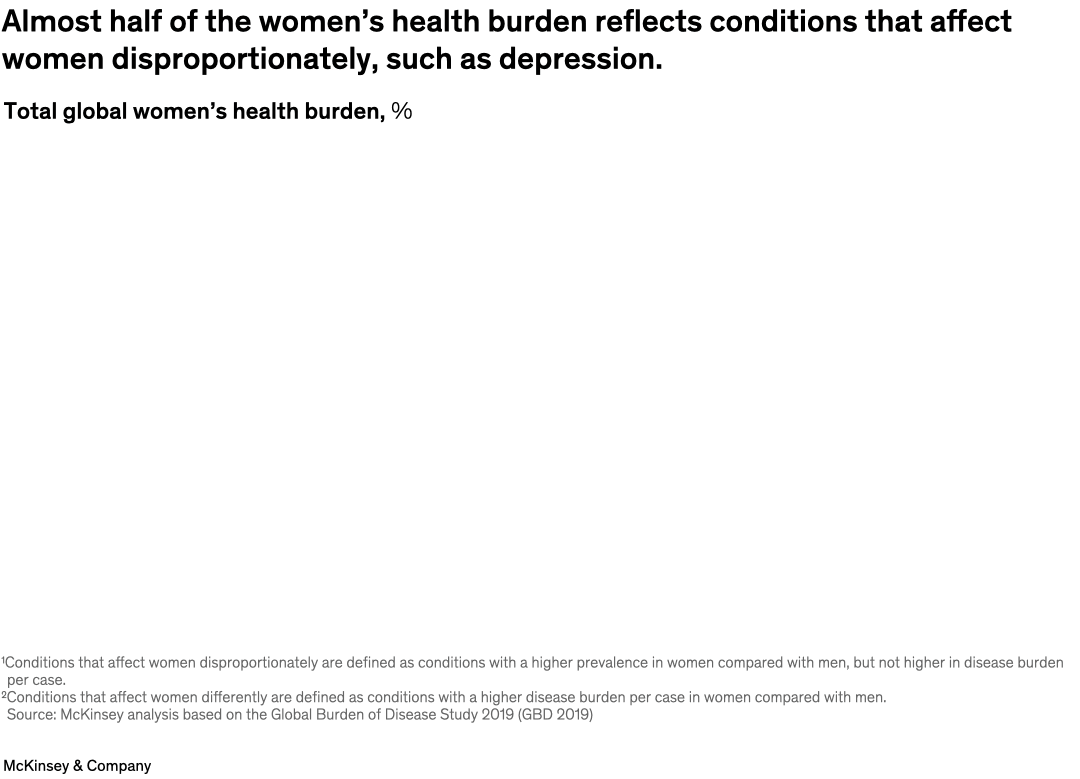 Research shows that SRH and maternal, newborn, and child health (MNCH) account for approximately 5 percent of women’s health burden,5 although this is probably an underestimate (Exhibit 3). An estimated 56 percent of the burden comes from health conditions that are more prevalent and/or manifest differently in women. The remaining 43 percent stems from conditions that do not affect women disproportionately or differently based on current evidence.