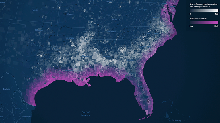 Over the past five years, weather disasters have cost the United States well over $600 billion. This interactive highlights how climate change uniquely affects the socioeconomic mobility of Black populations across the country. The mixed media approach includes “scrollytelling,” animations, and interactive heat maps. Dramatic visuals—swaying trees, flooded homes, and a darkened sky—combine to weave a poignant and compelling narrative. They paint a stark reality of lives upended, as depicted in the video of a man shielding his face as lightning strikes the sky—and his world.