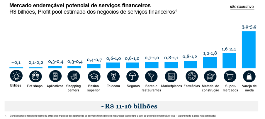 Uma análise da McKinsey estimou o mercado endereçável potencial de serviços financeiros para empresas não-financeiras no Brasil em cerca de R$ 11-16 bilhões, na maturidade. Em maior ou menor grau, as oportunidades existem em diversos segmentos e indústrias — em algumas delas, como no setor de vestuário, esses serviços já estão mais maduros e penetrados; em outras, como farmácias e pet shops, o potencial permanece ainda por ser explorado.