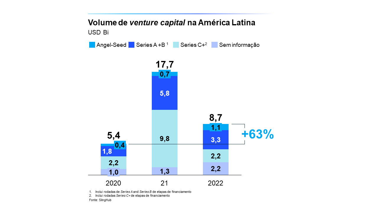 Agora, as boas notícias. Embora o volume total de capital disponível esteja menor que o pico de 2021, ainda estamos acima dos níveis pré-pandêmicos e em crescimento constante. As fontes de financiamento estão mais estáveis e diversificadas – os 10 maiores investidores ativos na América Latina foram responsáveis por 24% dos negócios em 2022, comparados aos 40% de 2021, mostrando que novos players do mercado ajudaram a fazer crescer e a repartir o bolo.