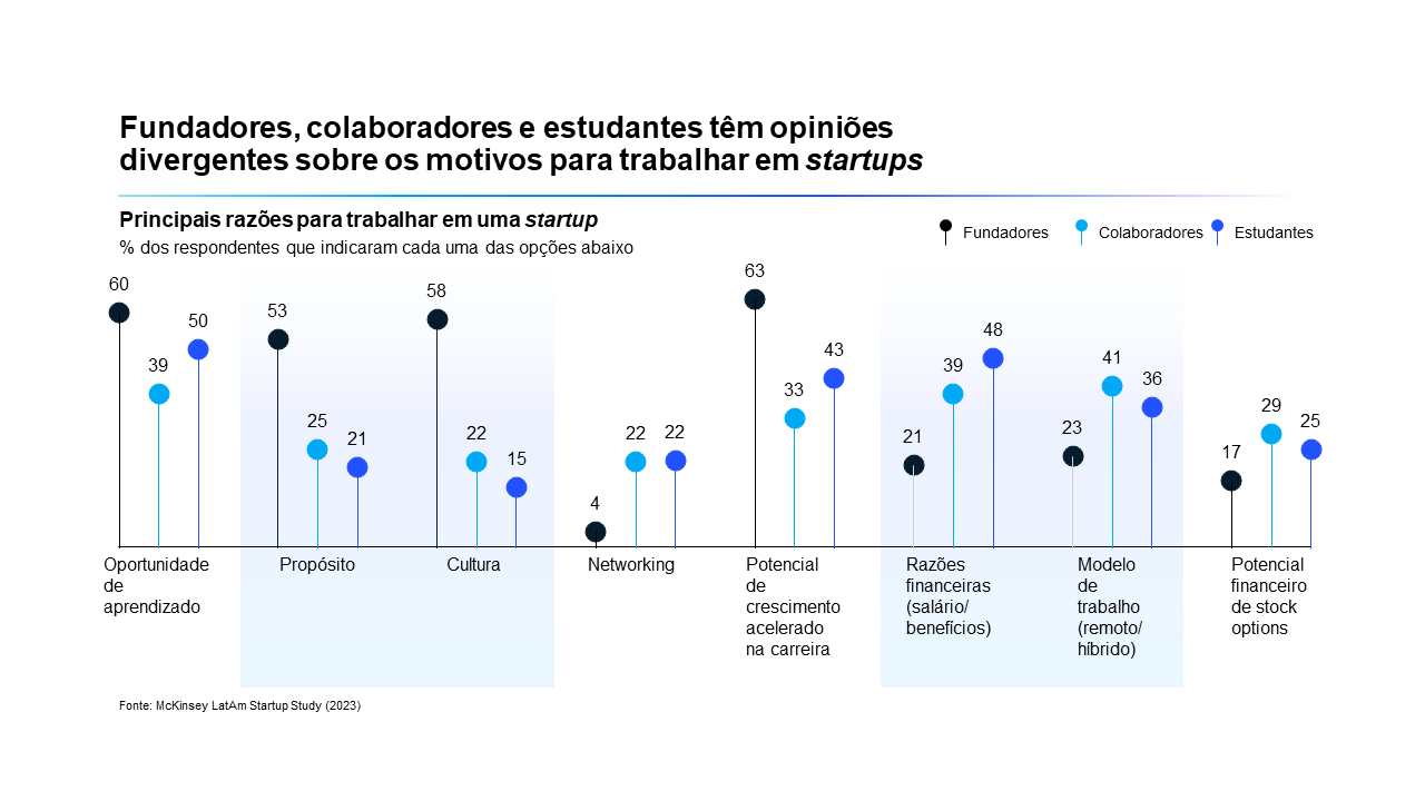 - Alinhamento da proposta de valor do colaborador (EVP): neste momento desafiador, fortalecer os fundamentos do time e da cultura é uma prioridade para 59% dos fundadores entrevistados. Conforme relatou um deles, “estamos apostando nas pessoas, garantindo que o talento certo está no lugar certo e com o plano de incentivo certo para manter a equipe motivada”. O desafio é que, hoje, a visão do que importa é bem diferente para fundadores, colaboradores e estudantes que estão ingressando no mercado de trabalho. Enquanto fundadores ainda acreditam que propósito, cultura e oportunidade de aprendizado são os fatores decisivos para atração de talentos, colaboradores e estudantes importam-se com aspectos mais objetivos, como salário e modelo de trabalho remoto.