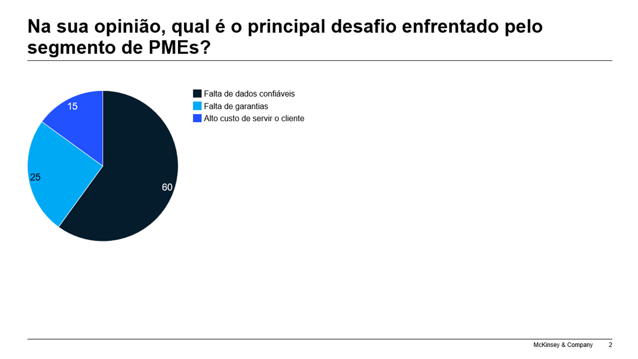 Na mesma pesquisa, executivos do setor financeiro também foram perguntados sobre os principais desafios para o segmento de PMEs. A falta de confiabilidade dos dados foi considerada por 60% dos respondentes como o principal deles. Já a falta de garantias e o alto custo de servir foram apontados por 25% e 15%, respectivamente, como os maiores desafios do setor.