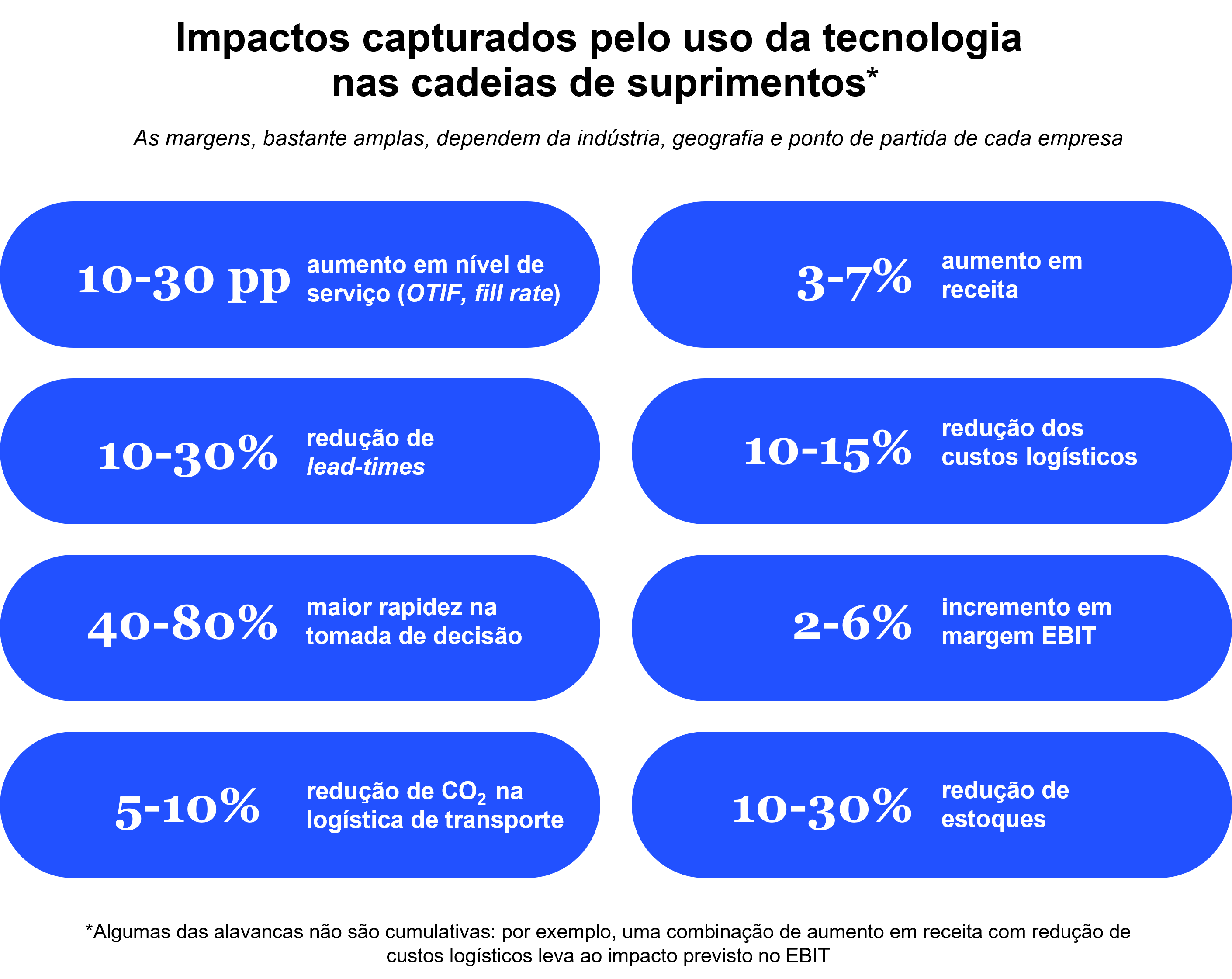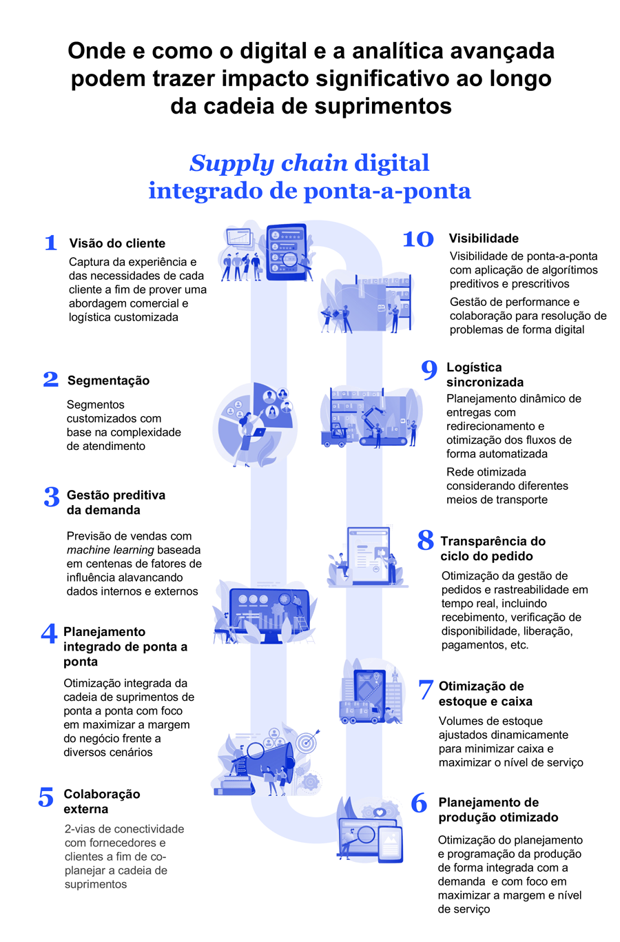 Além de dar visibilidade às operações, as soluções digitais para gerenciamento da cadeia de suprimentos são capazes de analisar grandes volumes de dados, entender relações entre eles e recomendar cenários ótimos. Por exemplo, modelos preditivos ajudam a entender causas e efeitos, aprender com dados anteriores para construir previsões e calcular rapidamente milhares de possibilidades. Assim, tecnologia digital e analítica avançada permitem tomadas de decisão melhores e mais eficientes, evitando complexidade desnecessária e boa parte do trabalho manual típico da área.