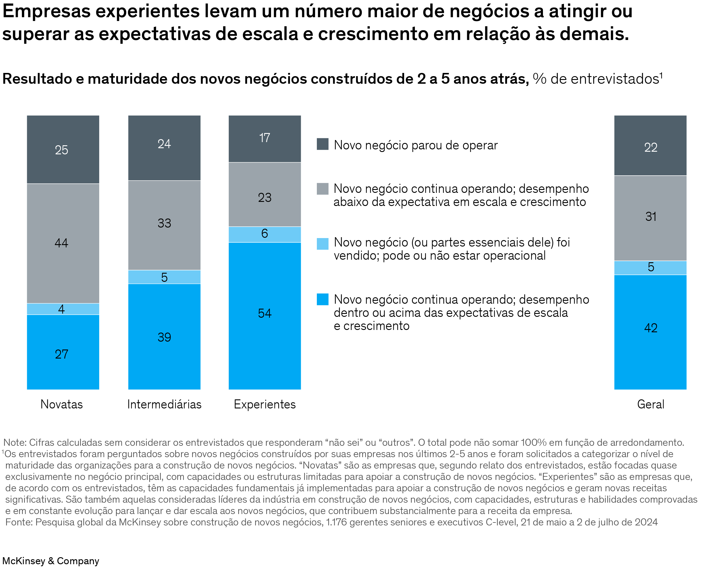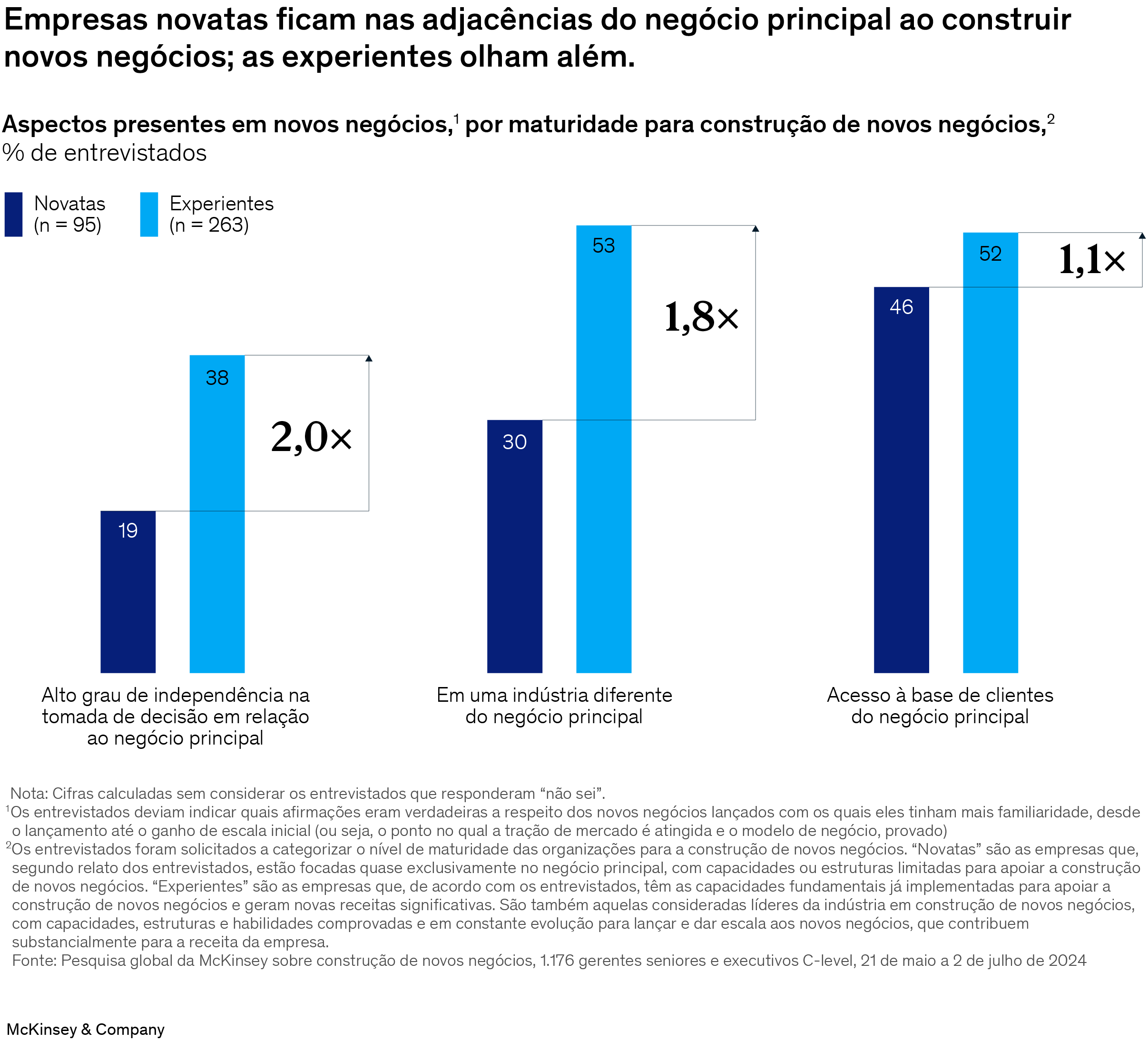 Os líderes empresariais estão assistindo à crescente ação de empresas experientes na construção de novos negócios e que dispõem de capacidades e estruturas de suporte maduras para ajudar a construir negócios em série. Essas organizações se diferenciam das demais na forma como abordam alocação de recursos, setup, liderança, talentos e capacitação. Além disso, elas apresentam crescimento orgânico 2,8 pontos percentuais maior e taxa de sucesso (a taxa que indica que uma empresa atingiu ou superou as expectativas de escala e crescimento) duas vezes maior do que as empresas que os entrevistados consideram novatas (aquelas que eles relatam ter capacidades ou estruturas limitadas para apoiar a construção de negócios). A evolução dessas empresas experientes explica, em certa medida, o fato de que os maiores novos negócios construídos por empresas incumbentes na última década registraram receita 1,5 vez superior à das maiores start-ups.