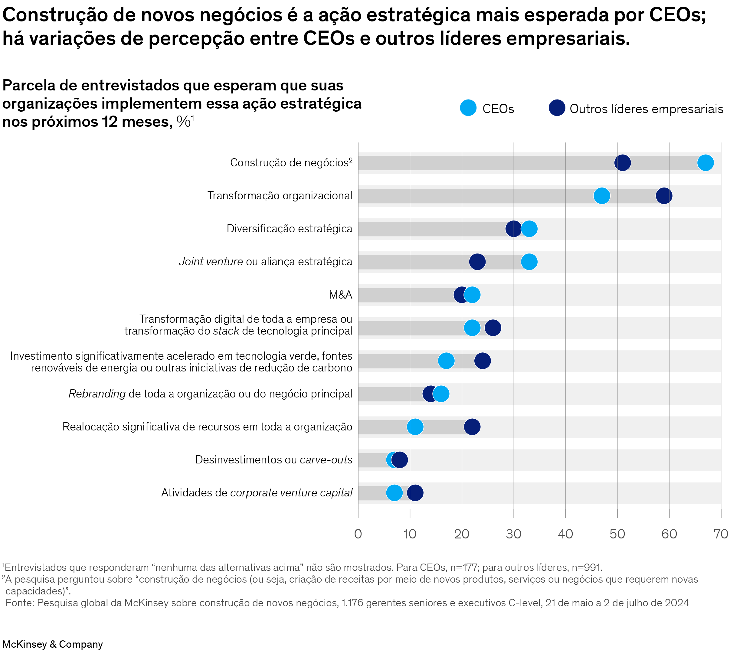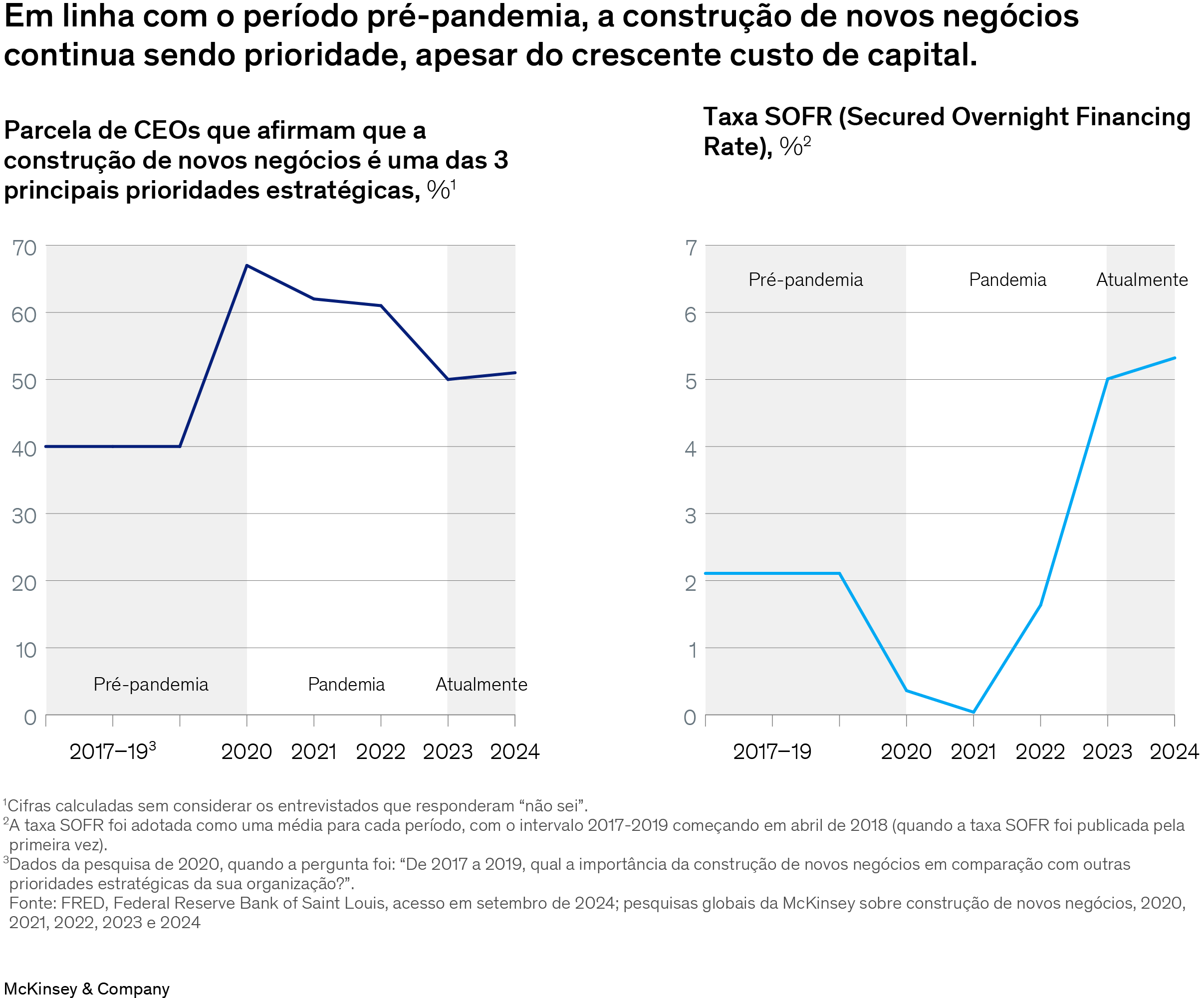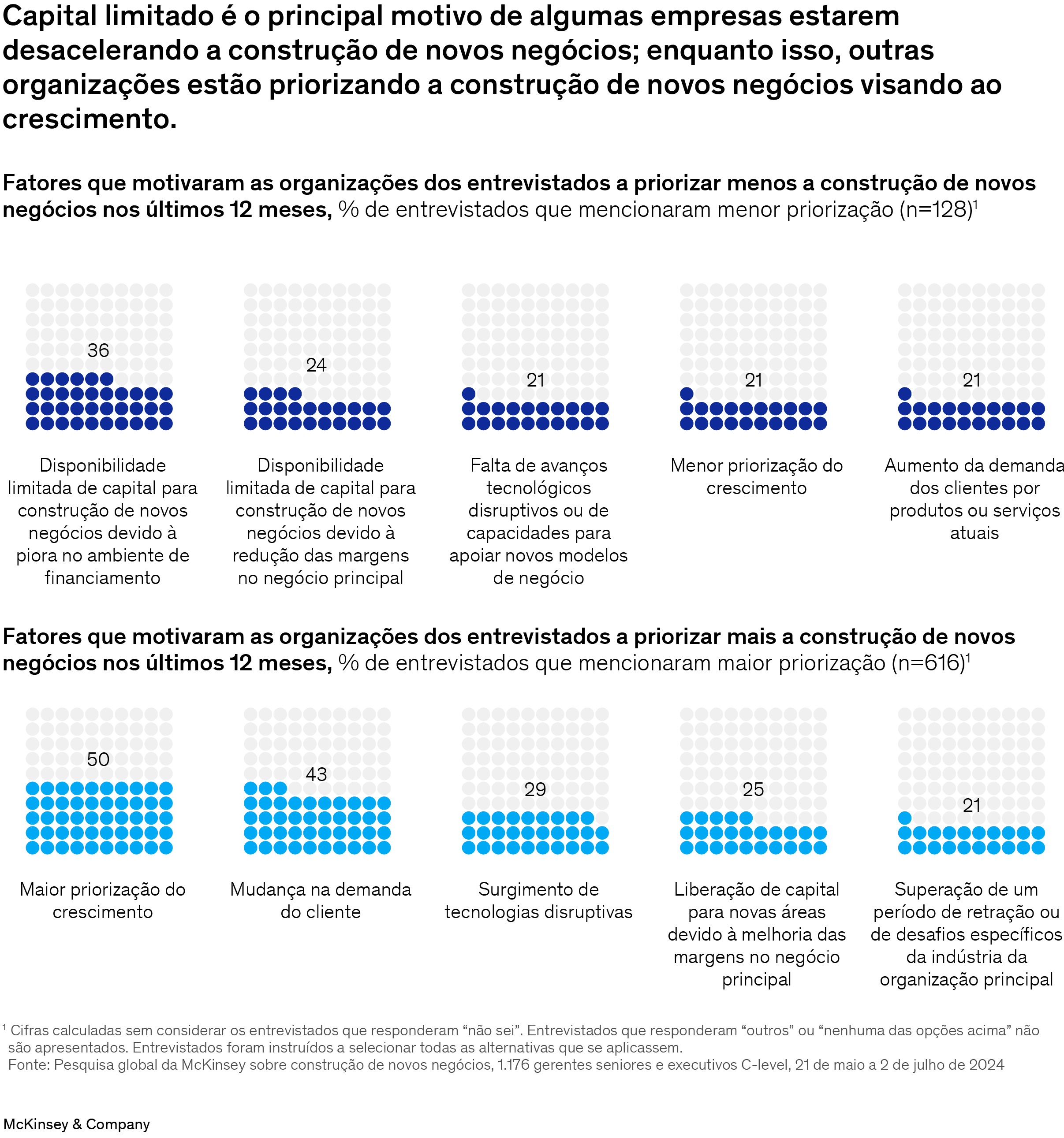 Em meio a tensões geopolíticas, recuo da inflação nas economias desenvolvidas e expectativa de cortes nas taxas de juros em algumas das maiores economias do mundo,1 metade dos CEOs ouvidos na quinta Pesquisa Global da McKinsey sobre a construção de novos negócios enxerga essa estratégia como uma de suas prioridades.