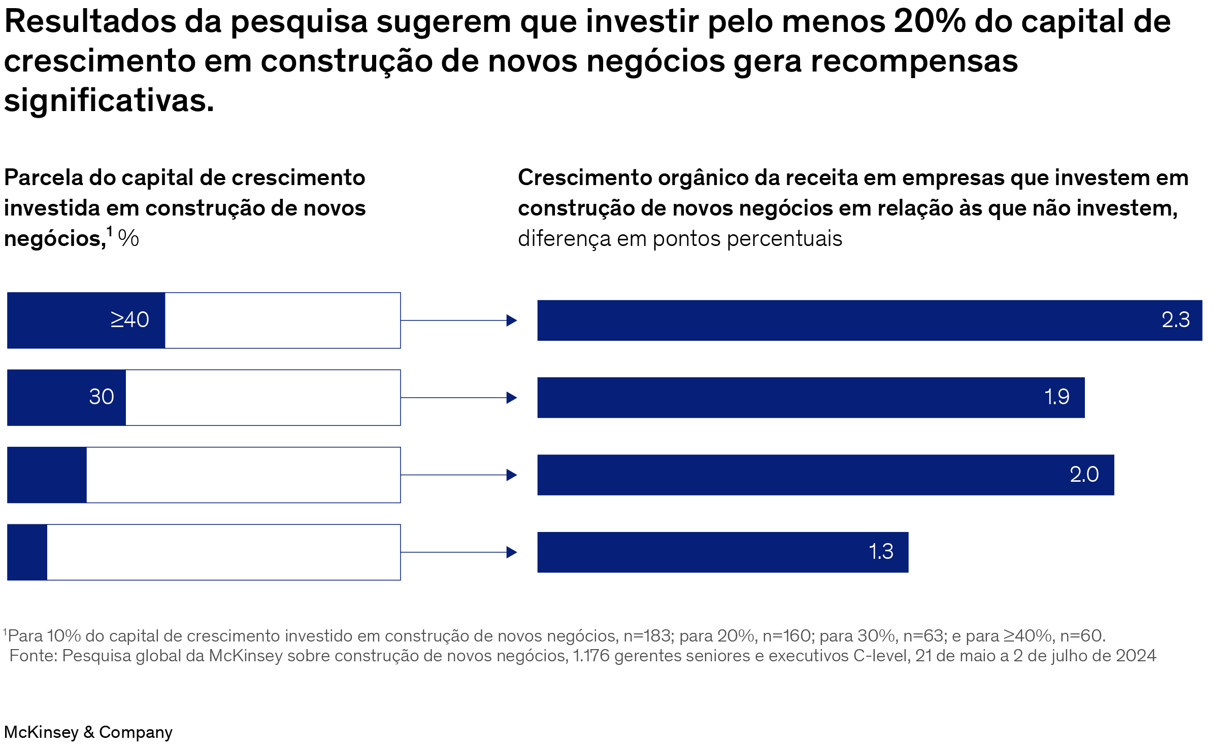 Em empresas que estão priorizando cada vez mais a construção de negócios, os entrevistados frequentemente dizem que os esforços são orientados pelo desejo de crescer – e há uma boa razão para isso. Resultados do nosso último levantamento sugerem que, em relação às empresas que não investem nada, as que investem 20% ou mais do seu capital de crescimento na construção de negócios inteiramente novos têm um crescimento de receita dois pontos percentuais maior.3 Para organizações maiores (com receitas anuais de $1 bilhão ou mais), com o mesmo cenário de investimento, o crescimento é ainda mais pronunciado: +2,5 pontos percentuais. Esse aumento pode representar quase 50% de crescimento adicional para organizações com $1 bilhão ou mais em receitas anuais, cujas taxas médias de crescimento em todo o mundo são de 5,2% — e um aumento incremental ainda maior quando consideramos a taxa mediana de crescimento, que é de 3,7%.4