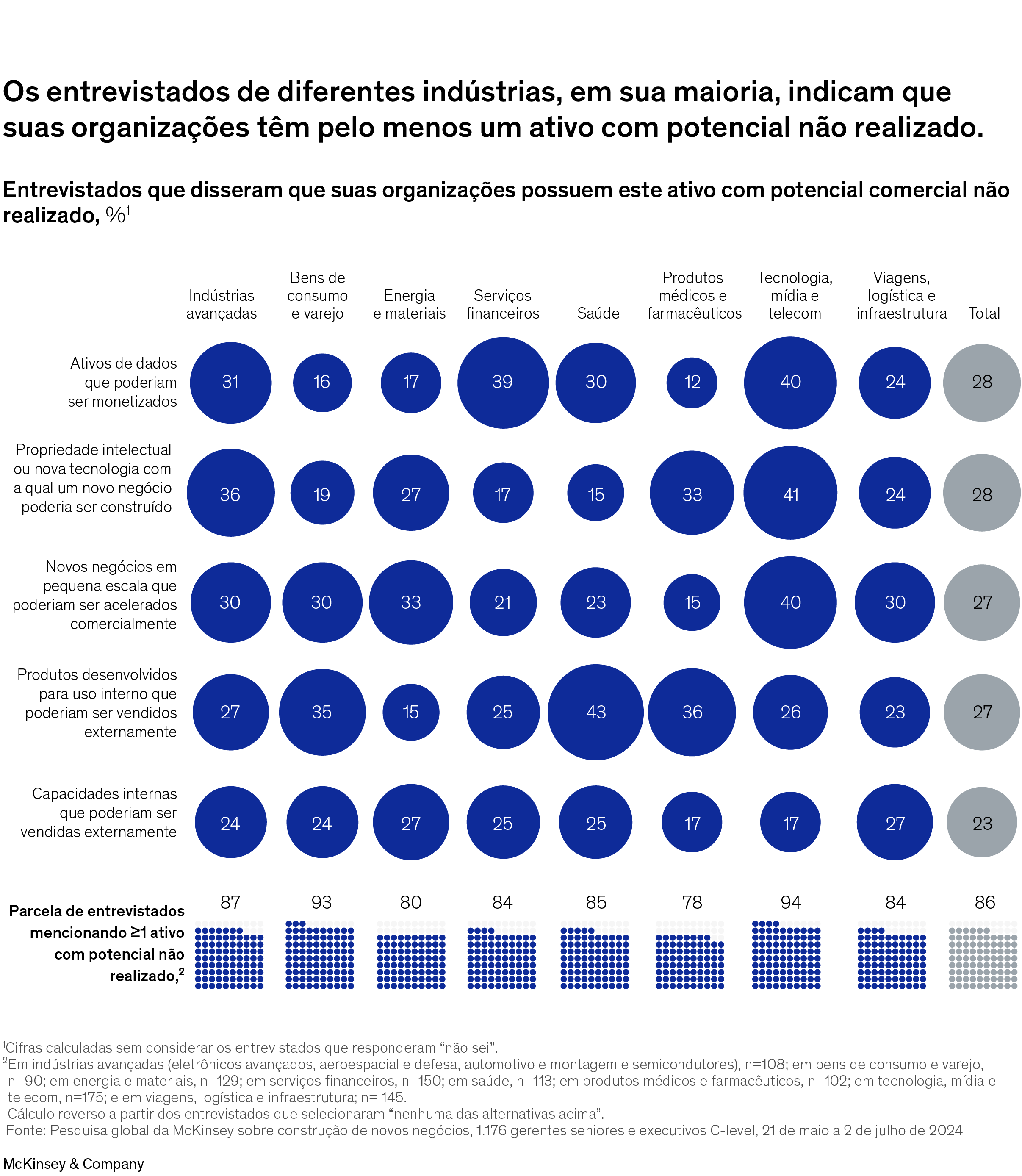 Por exemplo, os entrevistados dos setores de saúde, bens de consumo e varejo relatam com mais frequência que suas empresas têm produtos desenvolvidos para uso interno que poderiam ser vendidos externamente, enquanto entrevistados da área de serviços financeiros apontam ativos de dados que poderiam ser monetizados. Em indústrias avançadas8 e tecnologia, mídia e telecomunicações, os entrevistados muitas vezes afirmam que suas empresas têm propriedade intelectual ou novas tecnologias a partir das quais novos negócios poderiam ser construídos. Esse panorama fornece um ponto de partida para a busca por formas de acelerar o valor do potencial não realizado.