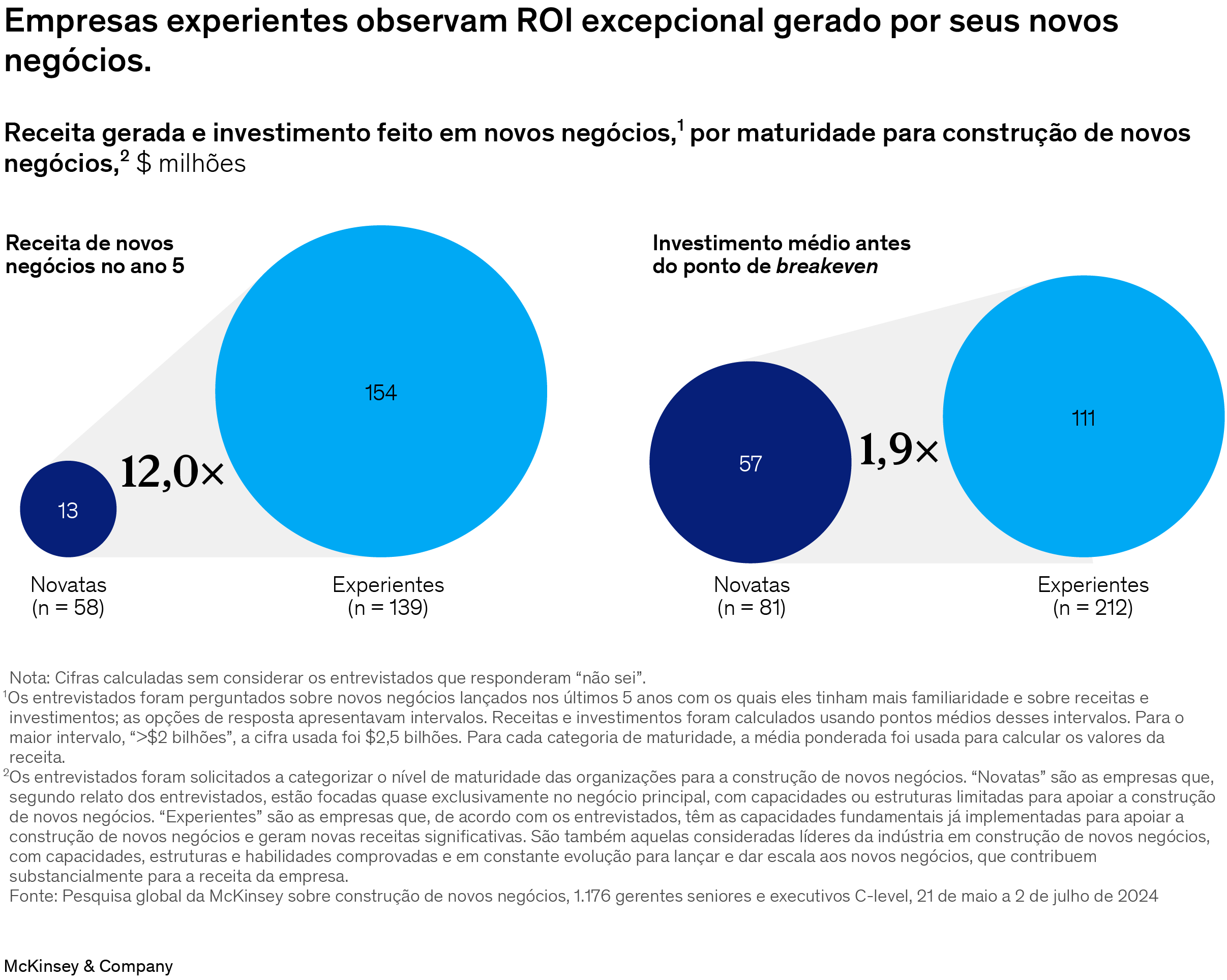 Os resultados da pesquisa deste ano evidenciam o que as empresas demonstram implicitamente há tempos: as organizações que desenvolveram as capacidades de construir novos negócios de forma programática experimentam mais sucesso por negócio. Essas empresas experientes na construção de negócios são duas vezes mais bem-sucedidas do que as organizações com menos maturidade no tema e geram receitas mais altas a partir de seus novos negócios.
