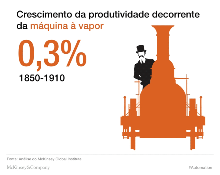 A automação das atividades poderá permitir que as empresas melhorem sua performance, reduzindo erros e aprimorando a qualidade e a velocidade – e, em alguns casos, obtendo resultados que vão além do que o ser humano é capaz de fazer. A automação também contribuirá para a produtividade, como sempre ocorreu ao longo da história. Em uma época de crescimento medíocre da produtividade, esse incremento daria um impulso muito necessário ao crescimento econômico e à prosperidade. Em muitos países, isso também ajudaria a reduzir o impacto do número cada vez menor da população economicamente ativa. Com base em nossa modelagem de cenários, estimamos que a automação tem condições de aumentar o crescimento da produtividade global de 0,8% a 1,4% ao ano (veja animação abaixo).